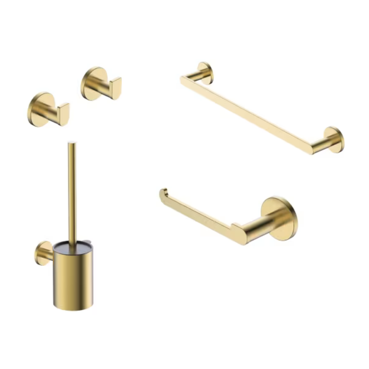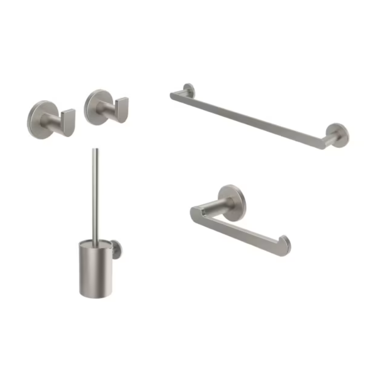 El set incluye los accesorios esenciales para mantener el baño ordenado y práctico: toallero, portarrollos, dos perchas y escobillero, todos diseñados para instalarse en pared y optimizar el espacio.