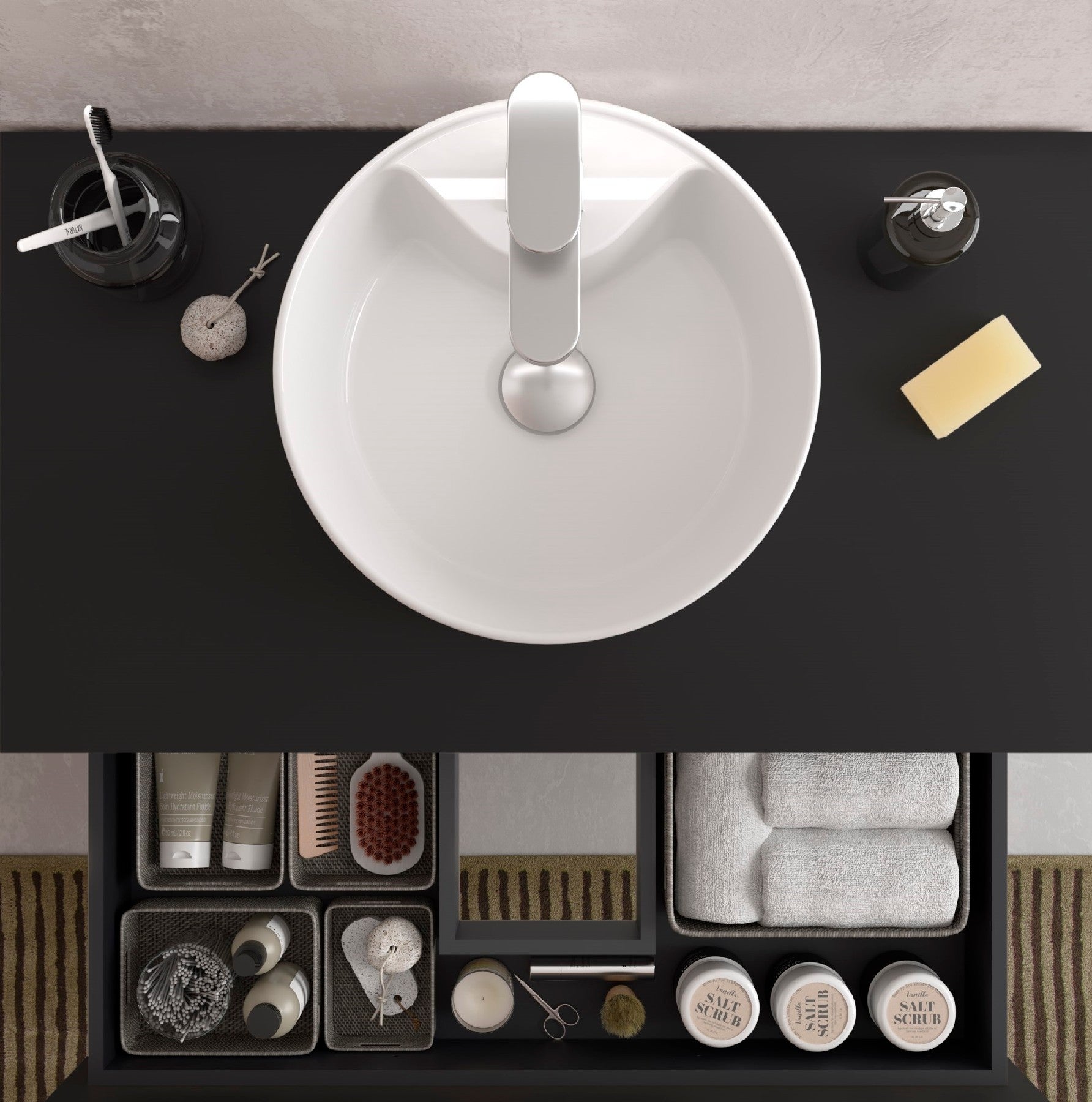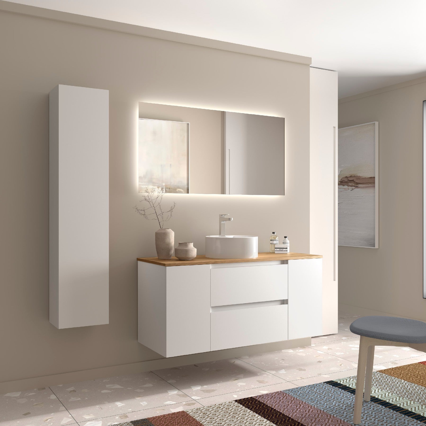 El lavabo de posar LISBOA de porcelana blanca brillo, con su acabado elegante y resistente, aporta luminosidad y un aire de sofisticación al conjunto. La encimera de 120 cm y 16 mm de grosor completa el diseño, ofreciendo una superficie sólida y estilizada.