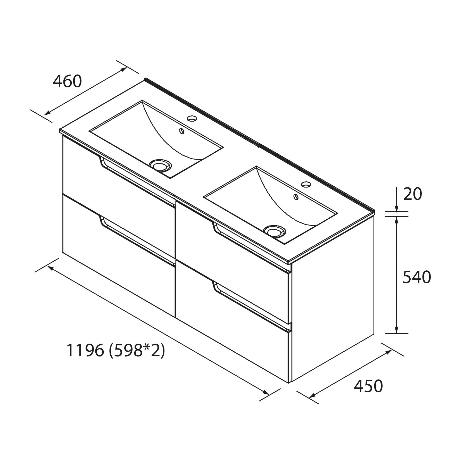 - Muebles de 60, 80 y 100 cm con 2 cajones, y de 120 cm con 4 cajones, ofreciendo gran capacidad de almacenamiento.