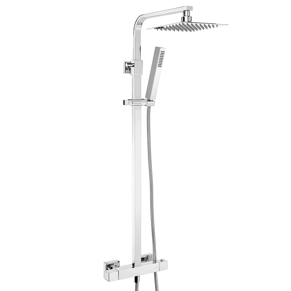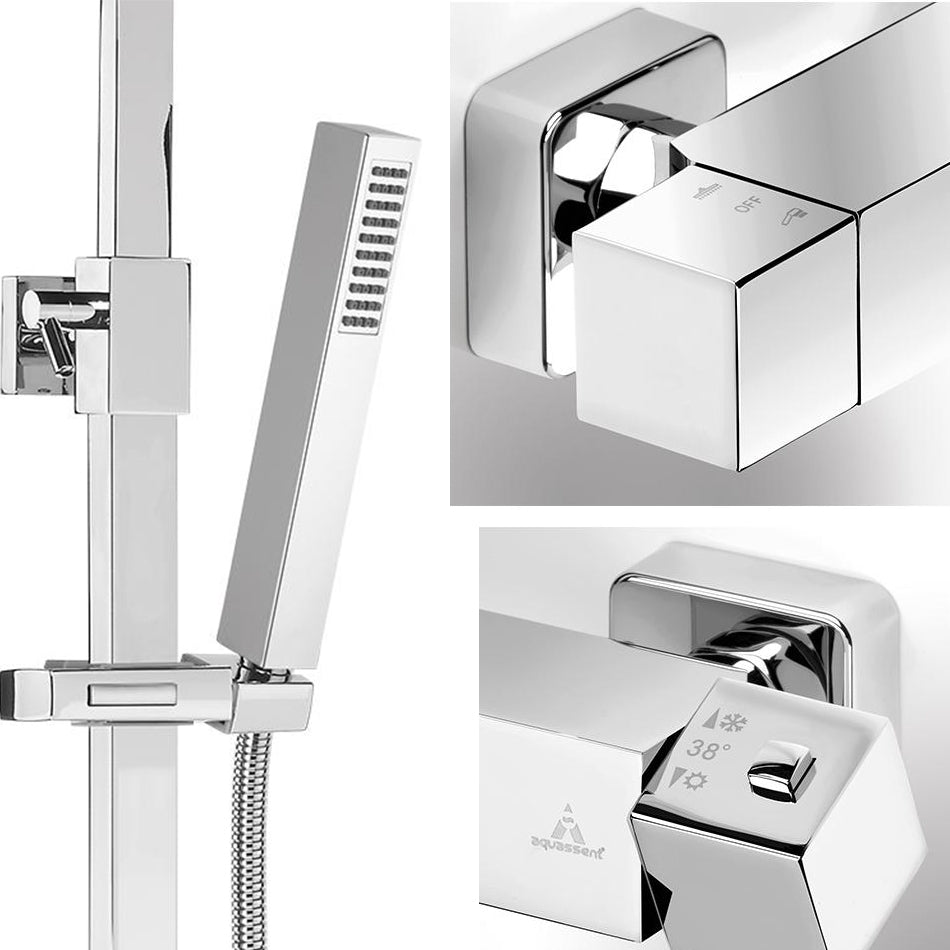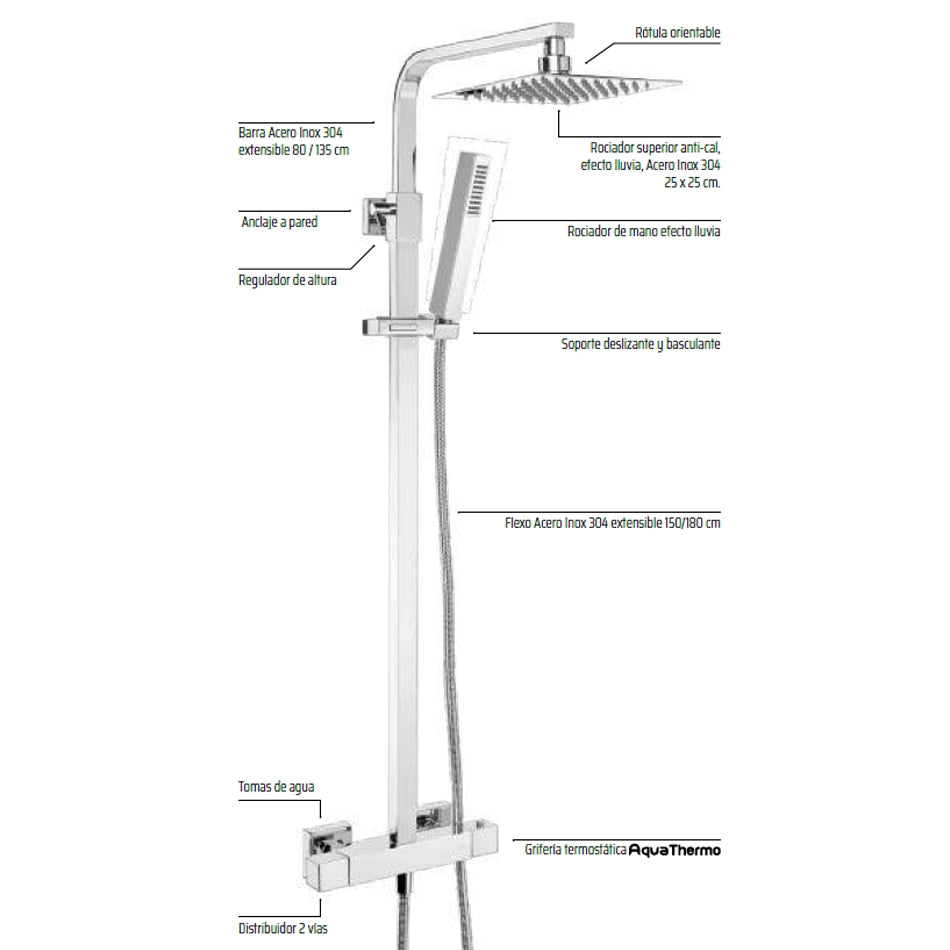 Ducha Termostática TENERIFE Aquassent | Rociador Cuadrado 25x25 cm | Barra Extensible 80-135 cm | Seguridad 38°C