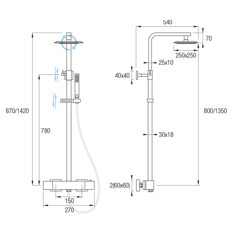 • Rociador cuadrado 25x25 cm orientable + ducha de mano