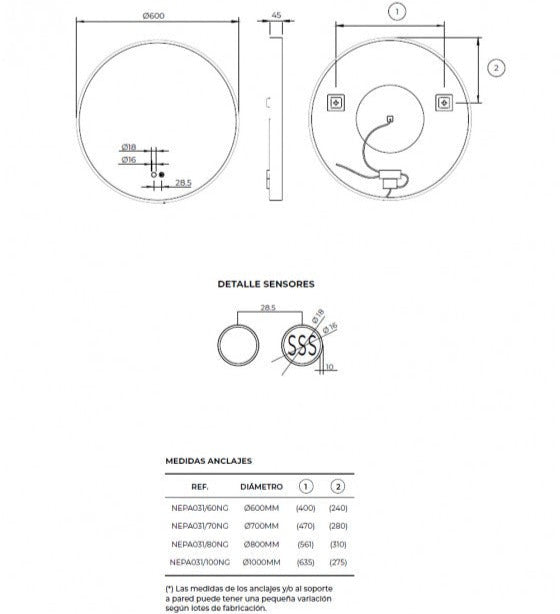 Disponible en cuatro tamaños (Ø60, Ø70, Ø80 y Ø100 cm), el espejo permite elegir entre tres temperaturas de luz —cálida (3.000K), neutra (4.000K) y fría (6.500K)—, adaptándose al ambiente y la estética de tu baño.