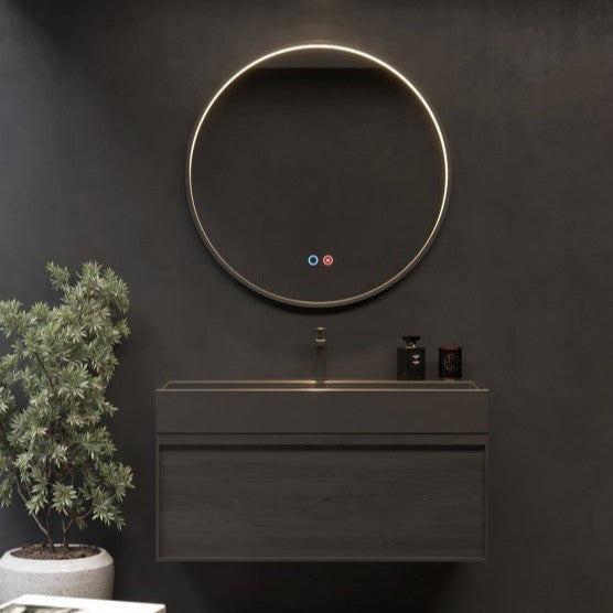 Su diseño redondo con luz perimetral integrada en un marco negro elegante aporta un toque contemporáneo y sofisticado a cualquier baño, convirtiéndose en el punto focal del espacio.