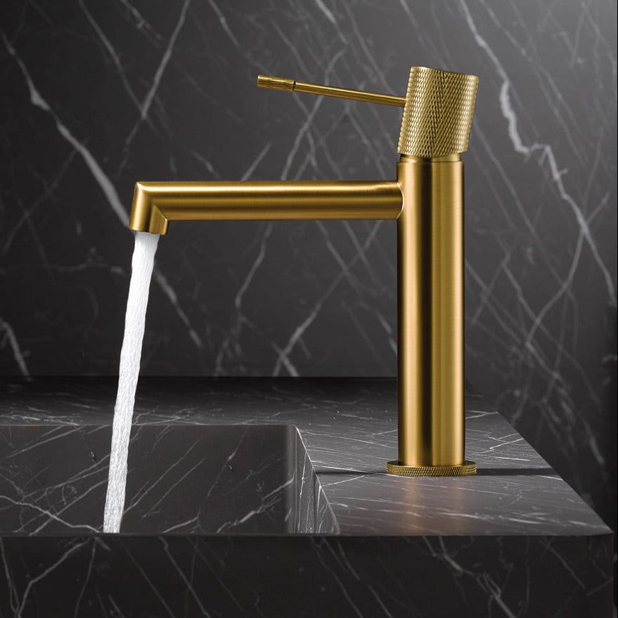 Aporta un toque de lujo contemporáneo a tu lavabo con este grifo en oro cepillado