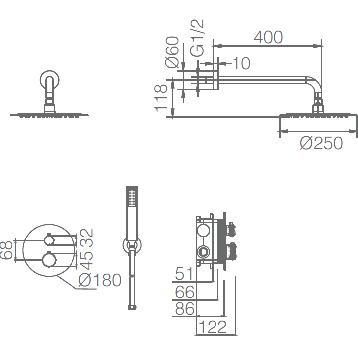 • Instalación versátil y completa: Incluye todo lo necesario (cuerpo empotrado, rociador de 25 cm, flexo, mango y brazo) y se adapta a un espesor de pared de entre 6.6 y 8.6 cm, ofreciendo flexibilidad en la reforma.