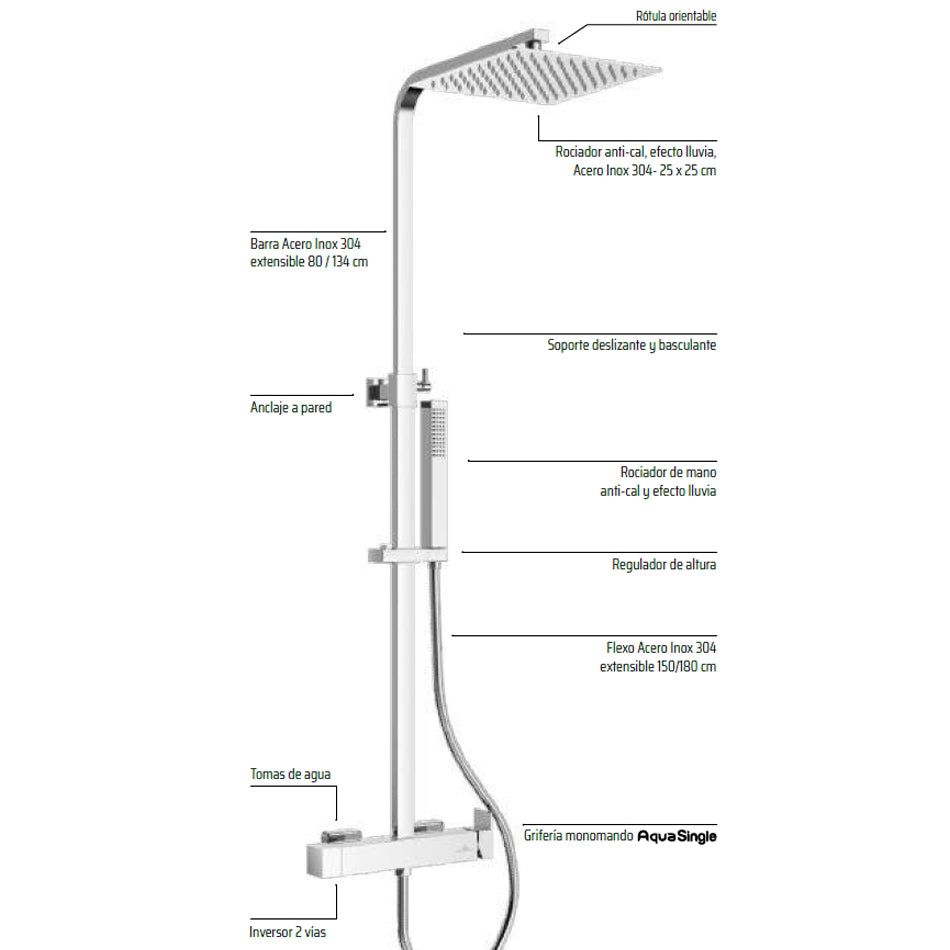 Kit Ducha GRECIA Aquassent | Monomando Termaclick 38°C | Rociador Cuadrado 25x25 cm | Barra Extensible 89-139 cm