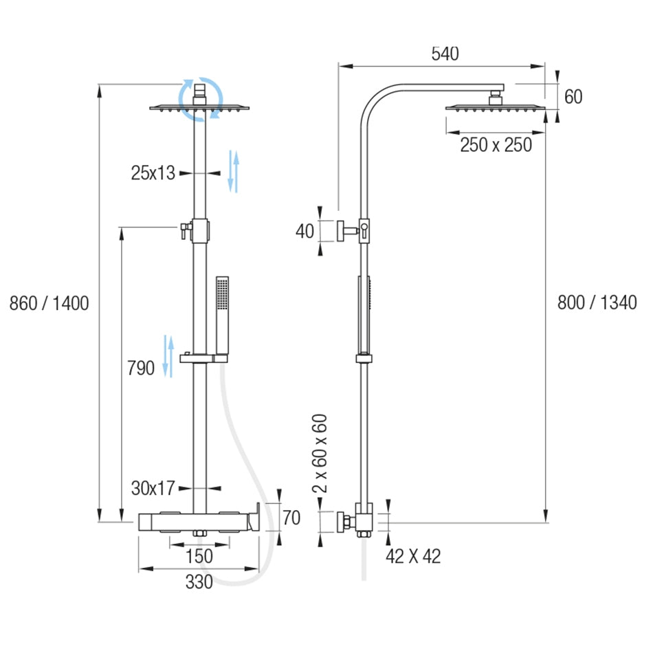 • Rociador cuadrado 25x25 cm + ducha de mano