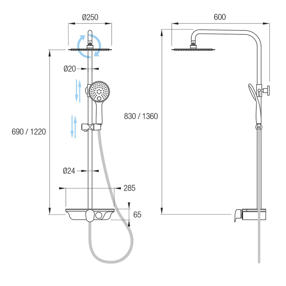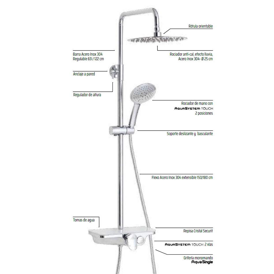Kit Ducha INDRA Aquassent | System Touch | Rociador 25 cm | Barra Extensible 69-122 cm | Cristal Securit