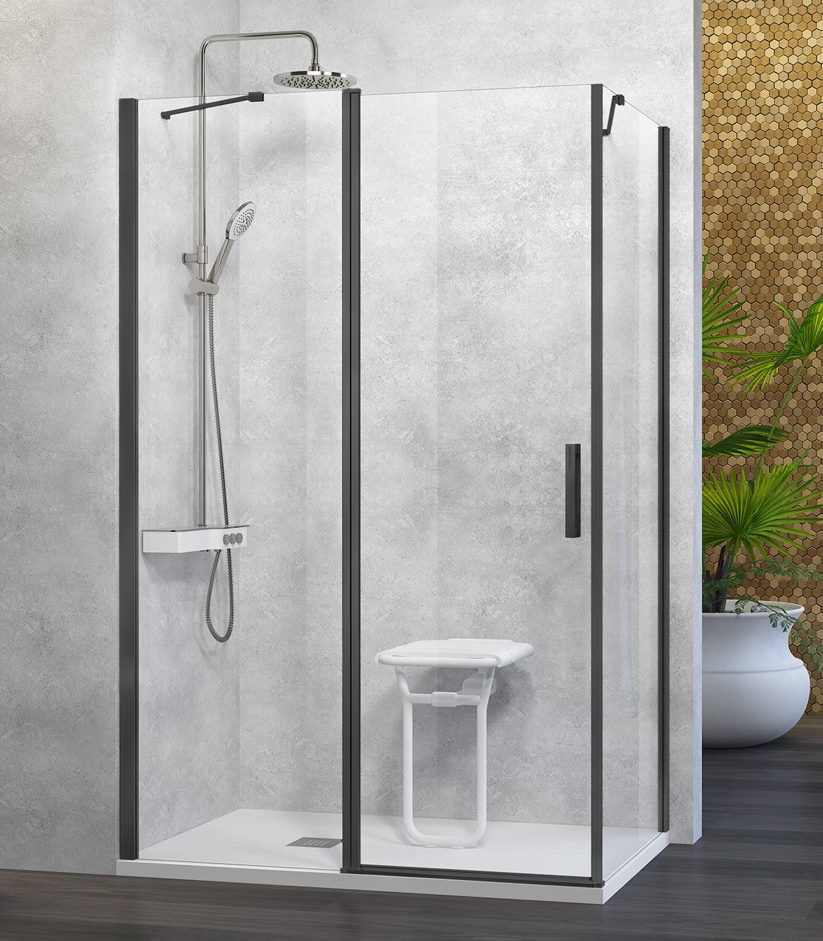 La elección perfecta si buscas una solución moderna, cómoda y funcional para tu ducha en esquina. Su diseño con un fijo frontal, una puerta abatible y un lateral fijo ofrece una apertura práctica incluso en baños con poco espacio o con elementos cercanos como el lavabo o el inodoro.