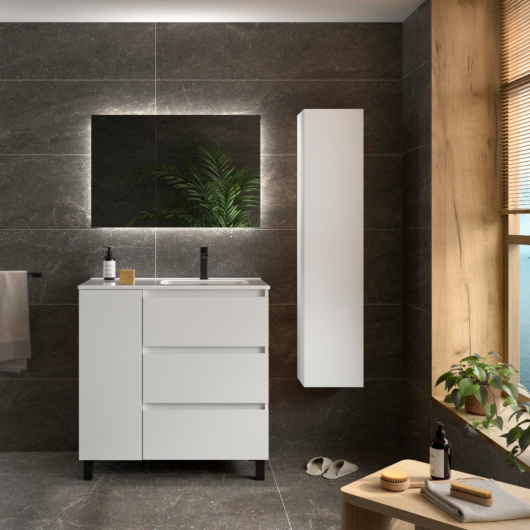 Fabricado con tableros laminados de alta calidad (16 mm) y cantos en PVC resistentes a la humedad, este mueble garantiza una gran resistencia en el día a día. Los cajones con cierre amortiguado y guías ocultas permiten un deslizamiento suave y silencioso, soportando hasta 25 kg de carga. Sus interiores en gris ónix aportan un toque elegante y fácil de limpiar.