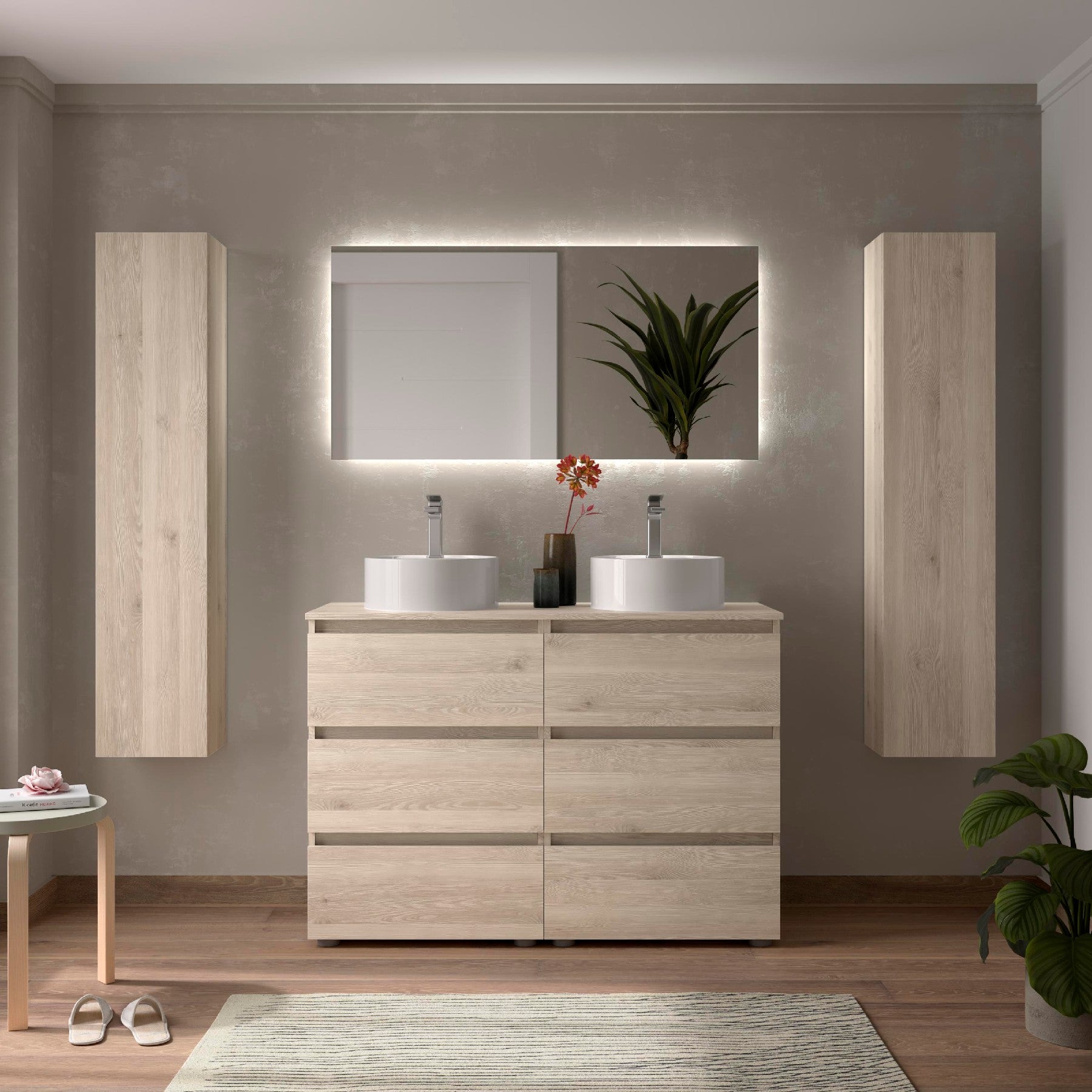 ✔ Fabricado en MDF clase E-1 con cantos en PVC, resistentes a la humedad del baño.