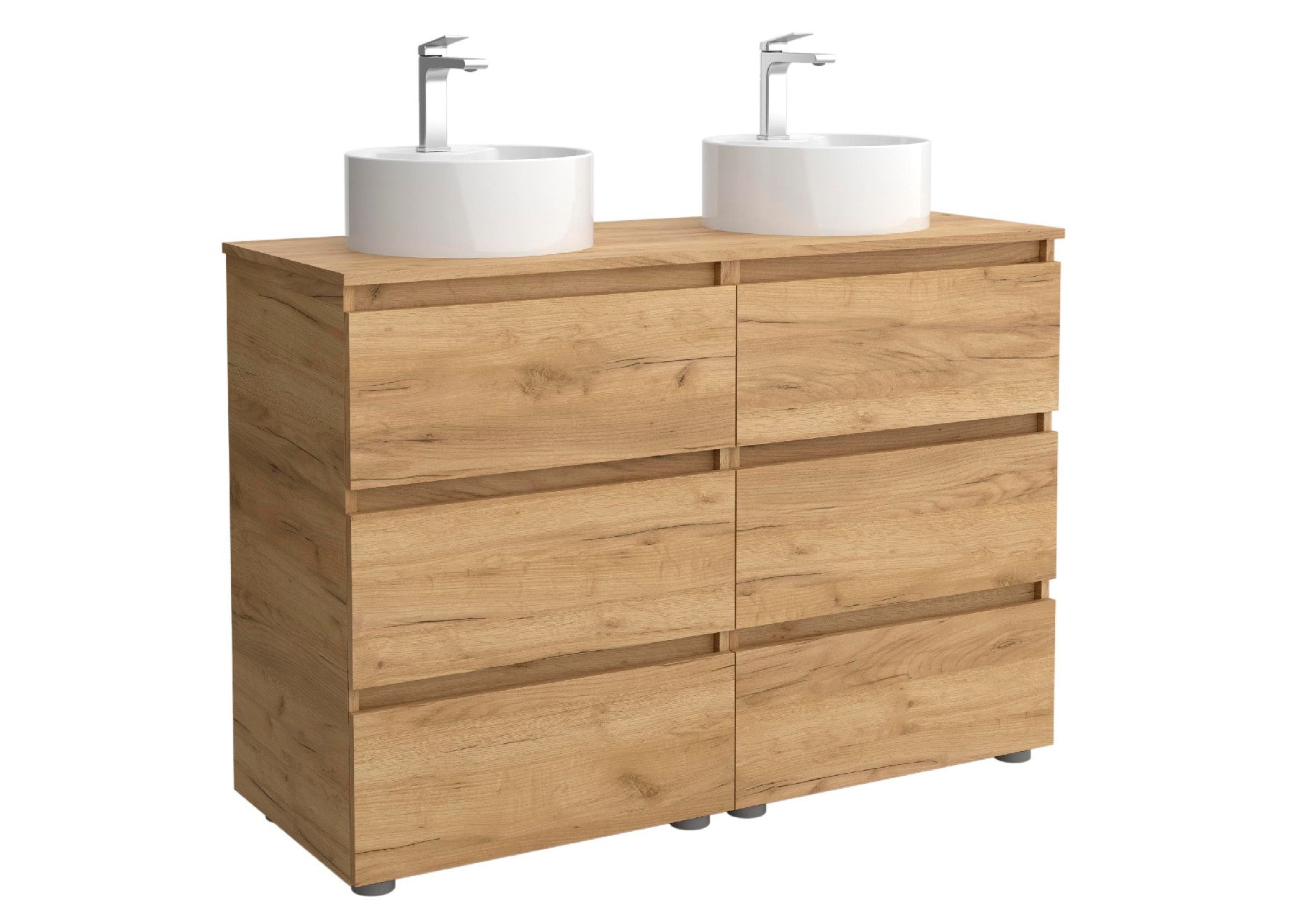Lavabo sobre encimera de porcelana blanca, con brillo duradero, resistente a rayaduras y productos químicos, garantizando un acabado impecable a lo largo del tiempo. 2 lavabos para la versión de 120 cm.