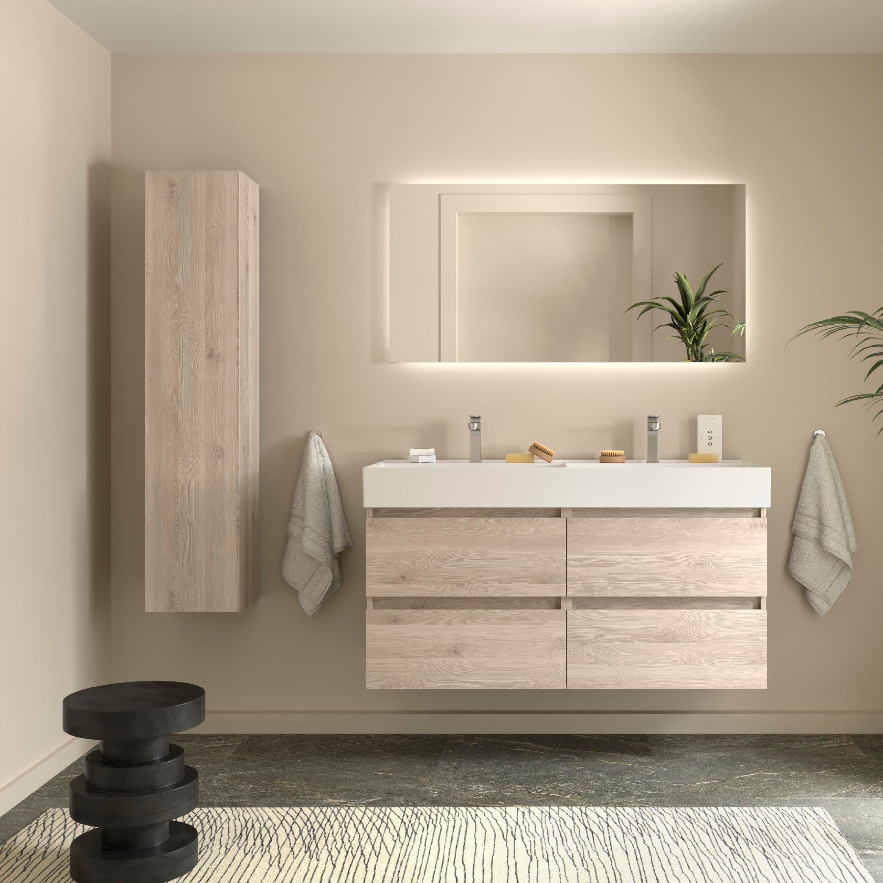 El mueble de baño suspendido Bequia aporta sensación de amplitud visual y facilita la limpieza del suelo. Sus dos cajones de gran capacidad, con cierre amortiguado Soft Close, garantizan un uso cómodo, silencioso y duradero en el día a día.