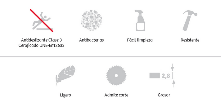 Antideslizante Clase 2 certificado UNE-En12633, que asegura la máxima seguridad frente a resbalones.