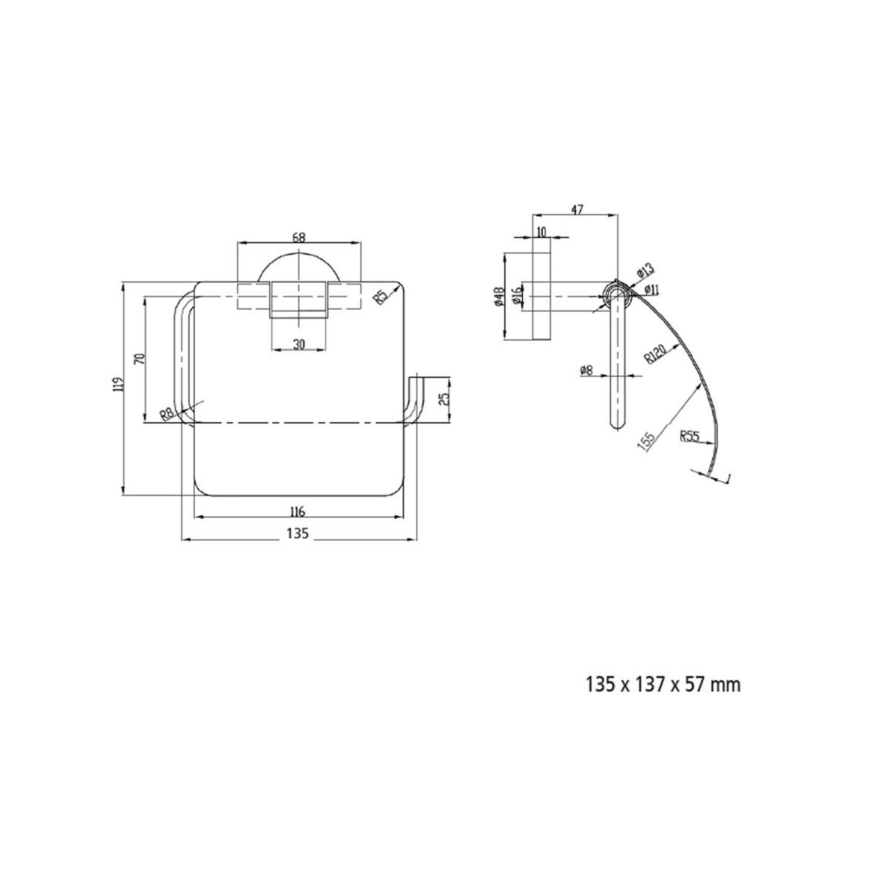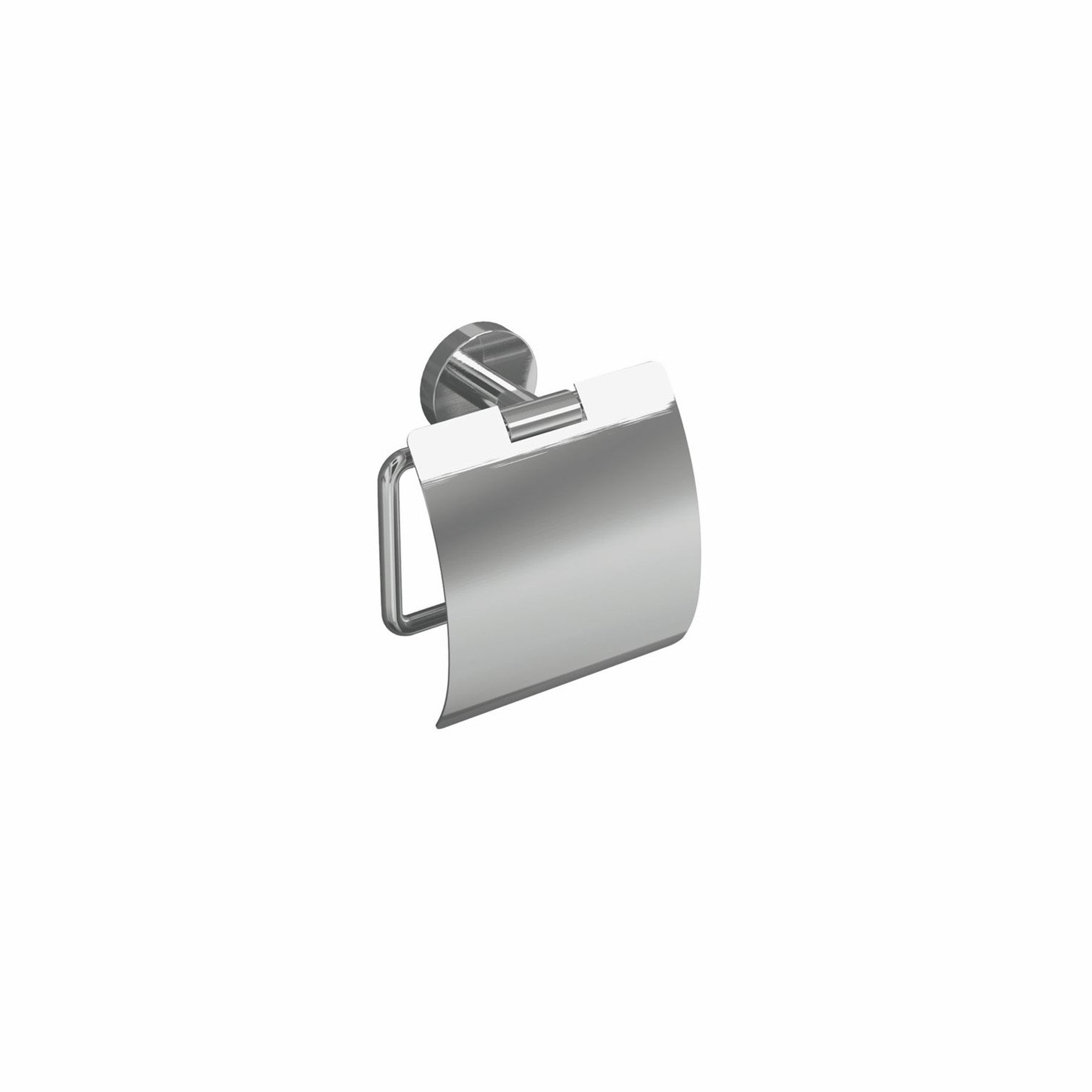 Portarrollos de baño RHIN HOTEL con tapa, fabricado en latón cromado para ocultar elegantemente el papel higiénico. Diseño compacto (13.5x13.7 cm) con instalación mural sencilla. Ideal para baños modernos que buscan un acabado limpio y sofisticado.
